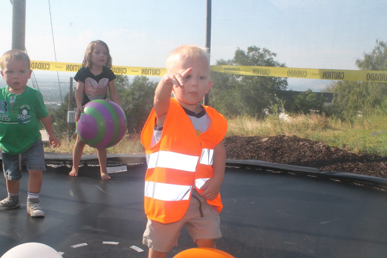 When the kids arrived, they walked down to the backyard on pavers with a sign that said "Party Zone". Until everyone got there, we let the kids play on the trampoline and the bounce house; each with a sign hanging on it that said "Break Room". Once everyone got there, we pulled the kids over to the "Demolition Zone" where they got to throw a soccer ball at a big stack of boxes to see who could demolish them. The kids loved it, and it was so fun to watch their faces get a 'proud' smile on them when they knocked it down and everyone cheered. We made sure to have them wear hard hats so they didn't get hurt. ;)